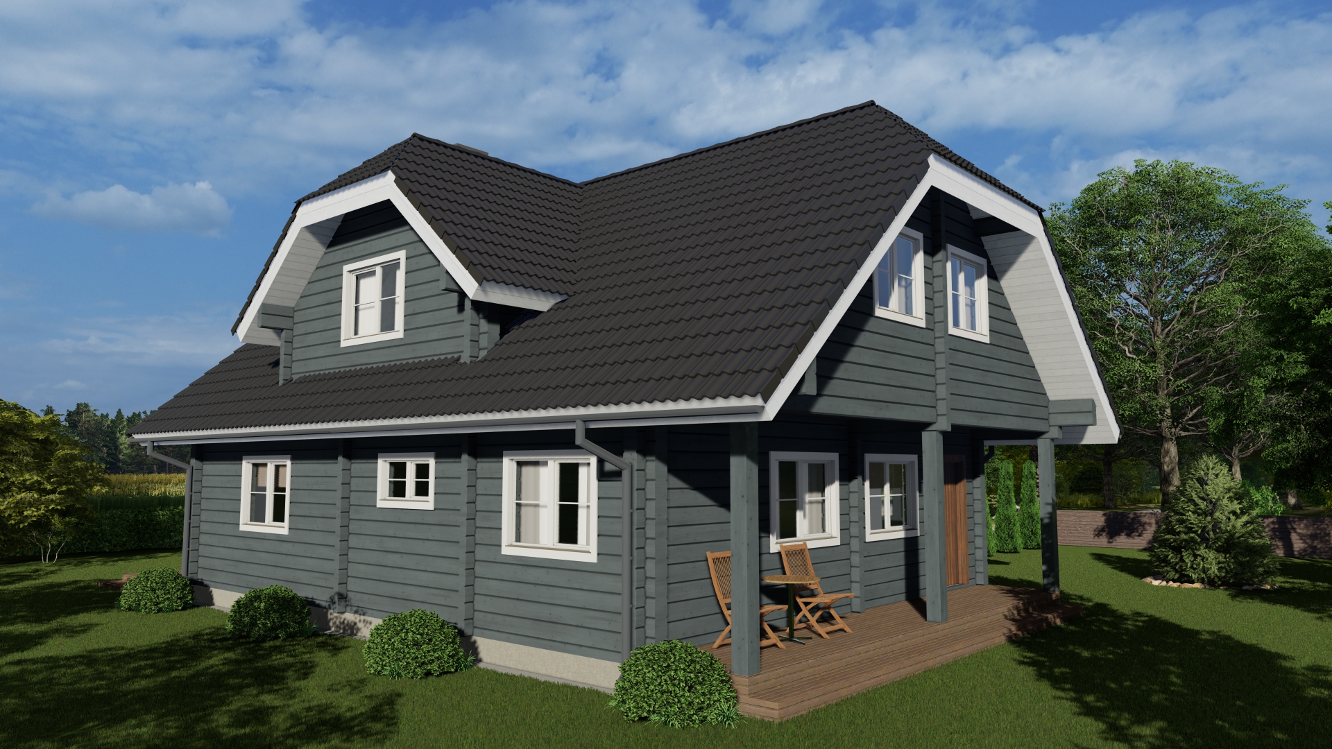 Lagle is a two-story log house, offering a spacious and practical design. The first floor includes a bright, open-plan living room and kitchen, a sauna, and utility rooms. The second floor features four bedrooms, but the layout allows additional rooms or repurposing a part of the indoor space into a covered balcony.